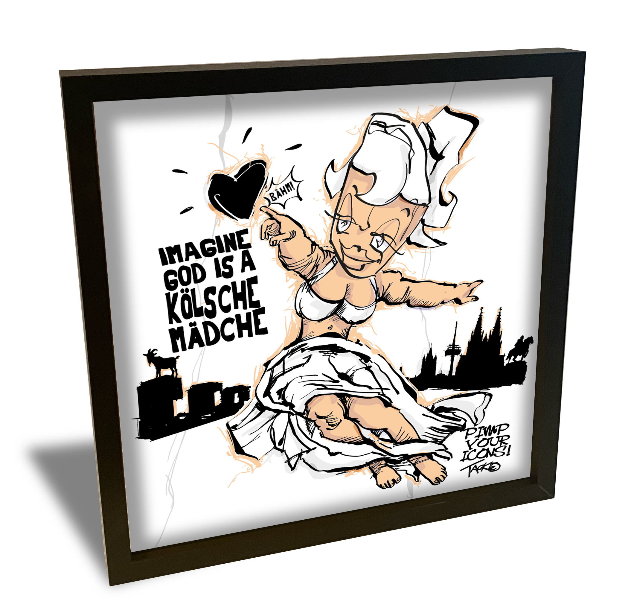 #KölnerArt – God is a Kölsche Mädche, schwarz gerahmt, 40 x 40 cm
